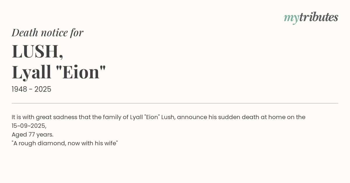 18°CIt is with great sadness that the family of Lyall "Eion" Lush, announce his sudden death at home on the 15~09~2025,