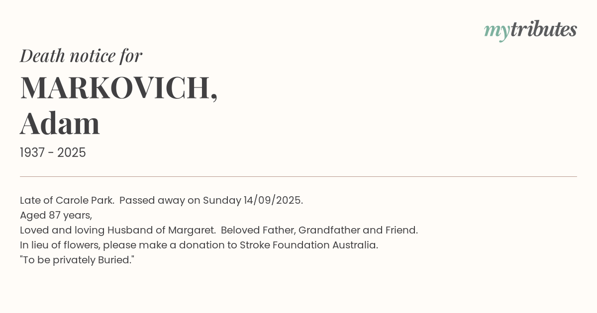 In lieu of flowers, please make a donation to Stroke Foundation Australia.