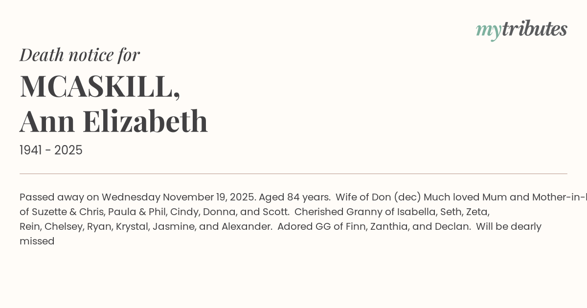 18°CPassed away on Wednesday November 19, 2025. Aged 84 years. Wife of Don (dec) Much loved Mum and Mother-in-law of Suzette & Chris, Paula & Phil, Cindy, Donna, and Scott. Cherished Granny of Isabella, Seth, Zeta, Rein, Chelsey, Ryan, Krystal, Jasmine, and Alexander. Adored GG of Finn, Zanthia, and Declan. “Will be dearly missed”