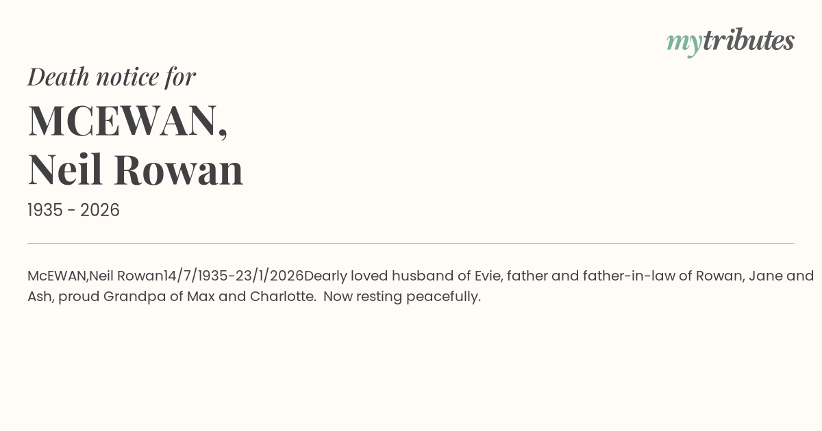 Dearly loved husband of Evie, father and father-in-law of Rowan, Jane and Ash, proud Grandpa of Max and Charlotte.