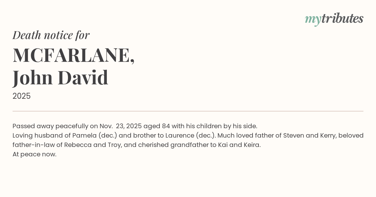 18°CPassed away peacefully on Nov. 23, 2025 aged 84 with his children by his side.
