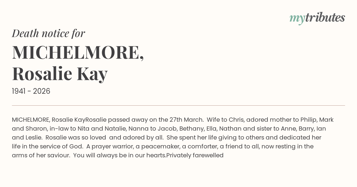 Rosalie passed away on the 27th March.