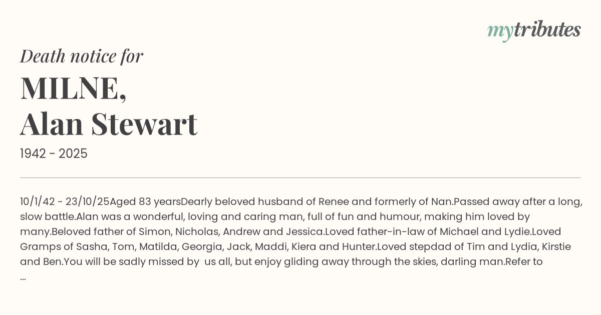 Alan was a wonderful, loving and caring man, full of fun and humour, making him loved by many.