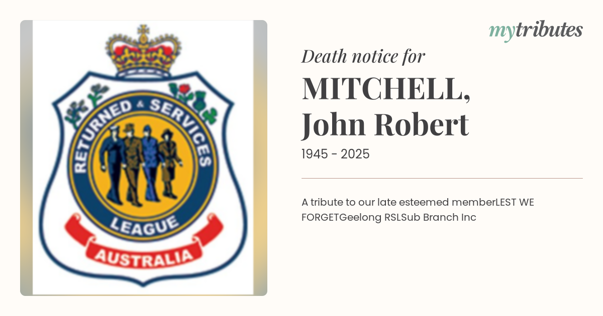 A tribute to our late esteemed memberLEST WE FORGETGeelong RSLSub Branch Inc