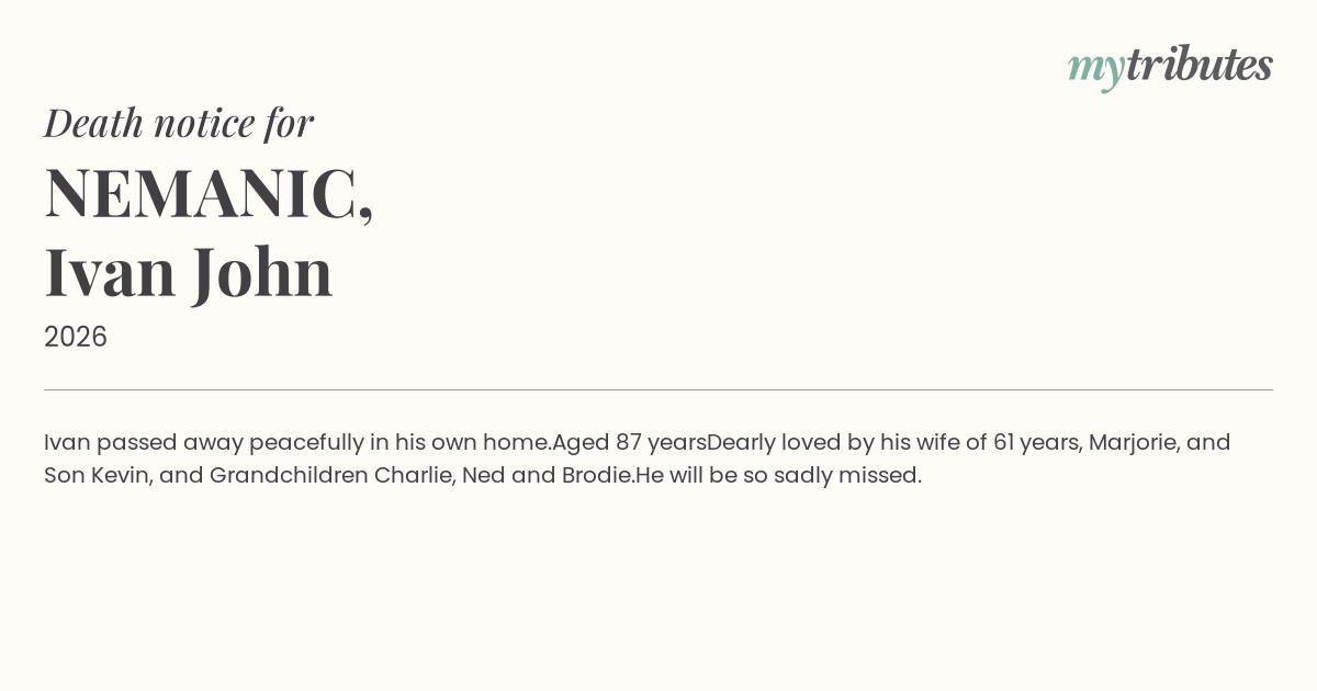 Dearly loved by his wife of 61 years, Marjorie, and Son Kevin, and Grandchildren Charlie, Ned and Brodie.