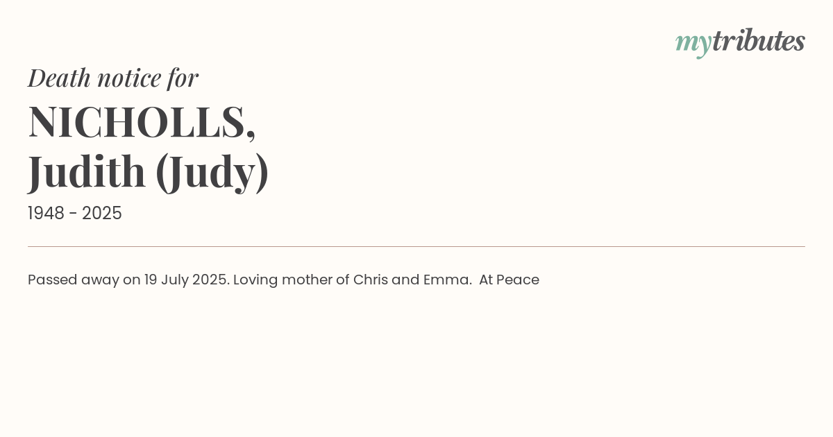 18°CPassed away on 19 July 2025. Loving mother of Chris and Emma. At Peace