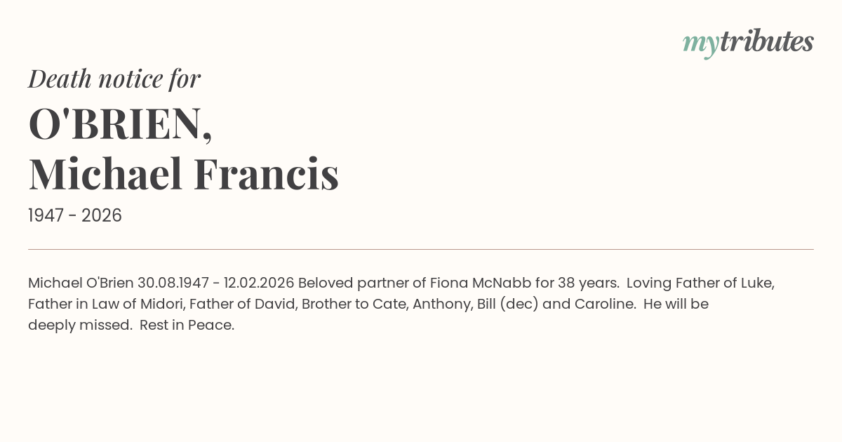 18°CMichael O'Brien 30.08.1947 - 12.02.2026 Beloved partner of Fiona McNabb for 38 years. Loving Father of Luke, Father in Law of Midori, Father of David, Brother to Cate, Anthony, Bill (dec) and Caroline. He will be deeply missed. Rest in Peace.