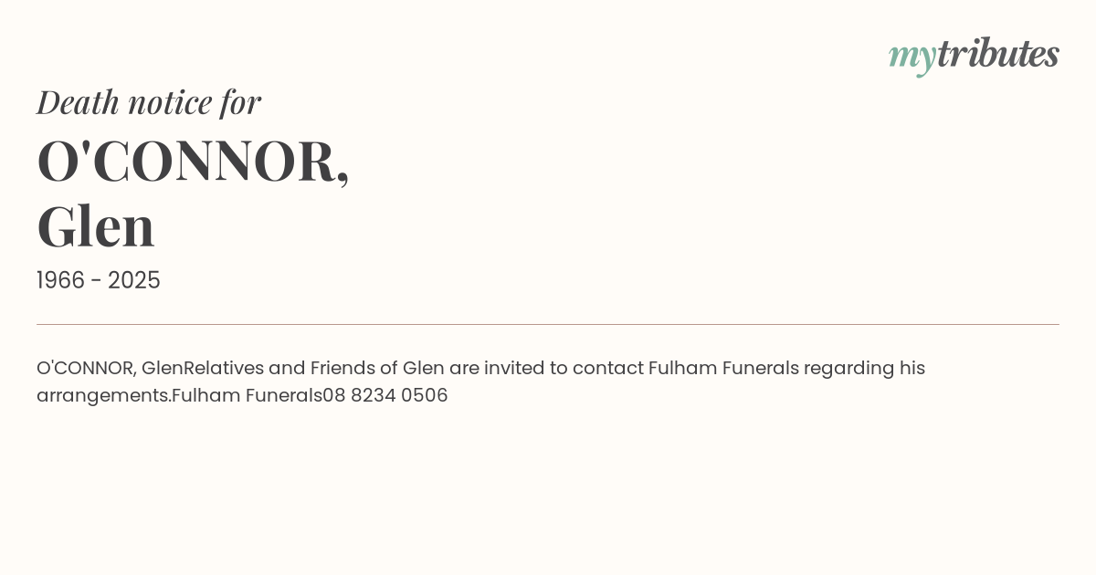 Relatives and Friends of Glen are invited to contact Fulham Funerals regarding his arrangements.