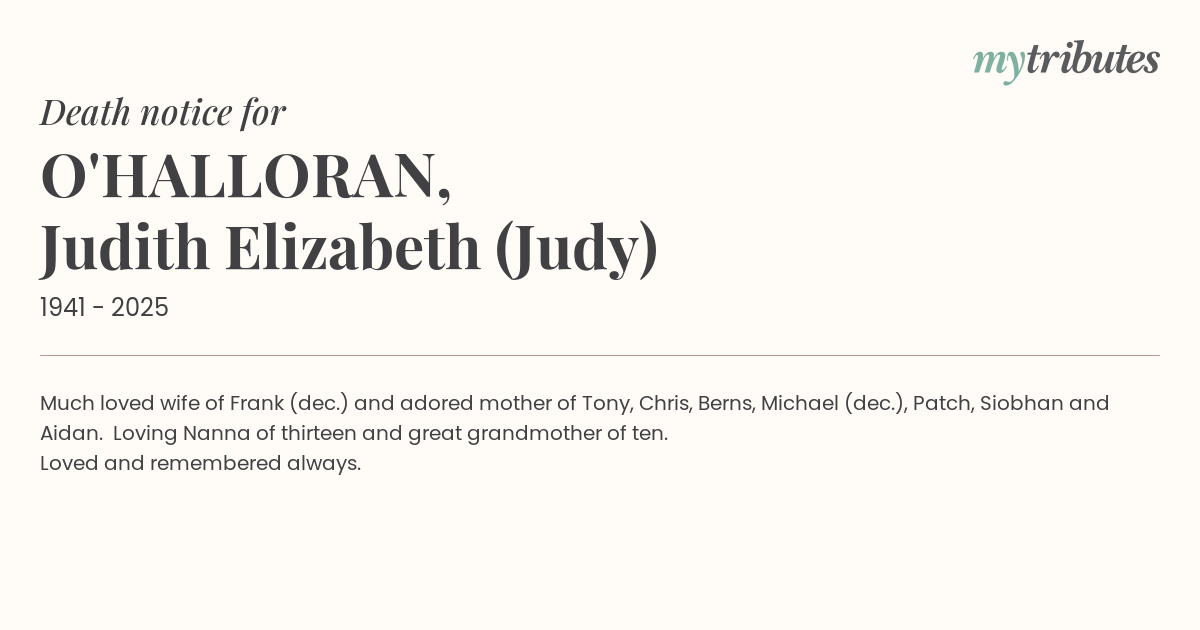 18°CMuch loved wife of Frank (dec.) and adored mother of Tony, Chris, Berns, Michael (dec.), Patch, Siobhan and Aidan. Loving Nanna of thirteen and great grandmother of ten.