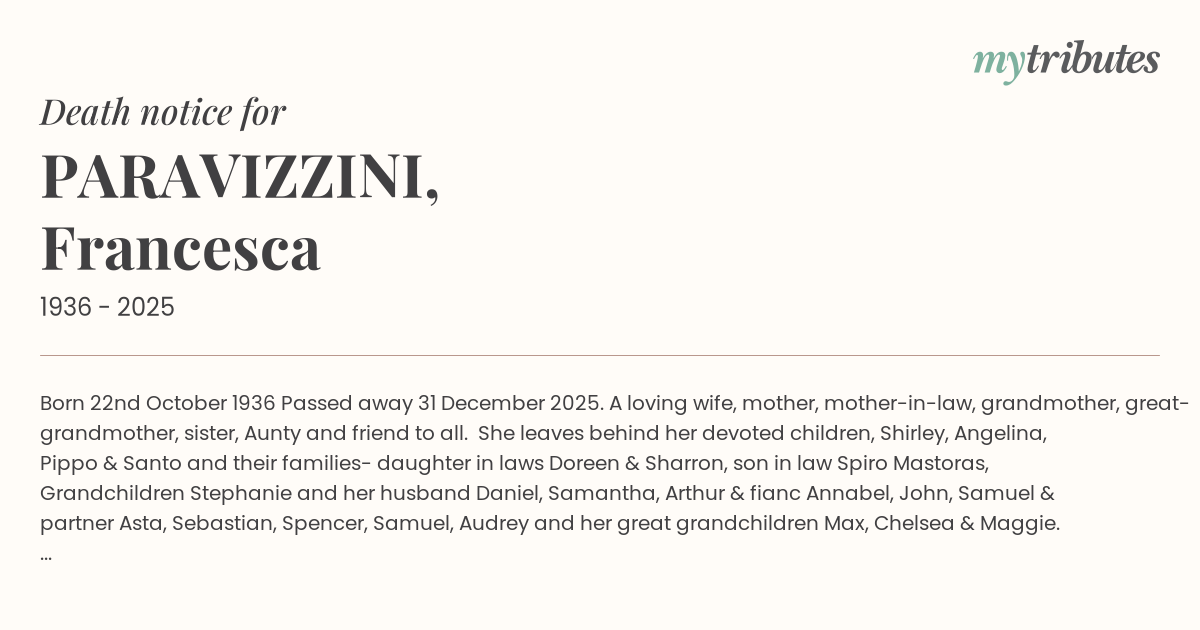 She leaves behind her devoted children, Shirley, Angelina, Pippo & Santo and their families- daughter in laws Doreen & Sharron, son in law Spiro Mastoras, Grandchildren Stephanie and her husband Daniel, Samantha, Arthur & fiancé Annabel, John, Samuel & partner Asta, Sebastian, Spencer, Samuel, Audrey and her great grandchildren Max, Chelsea & Maggie.
