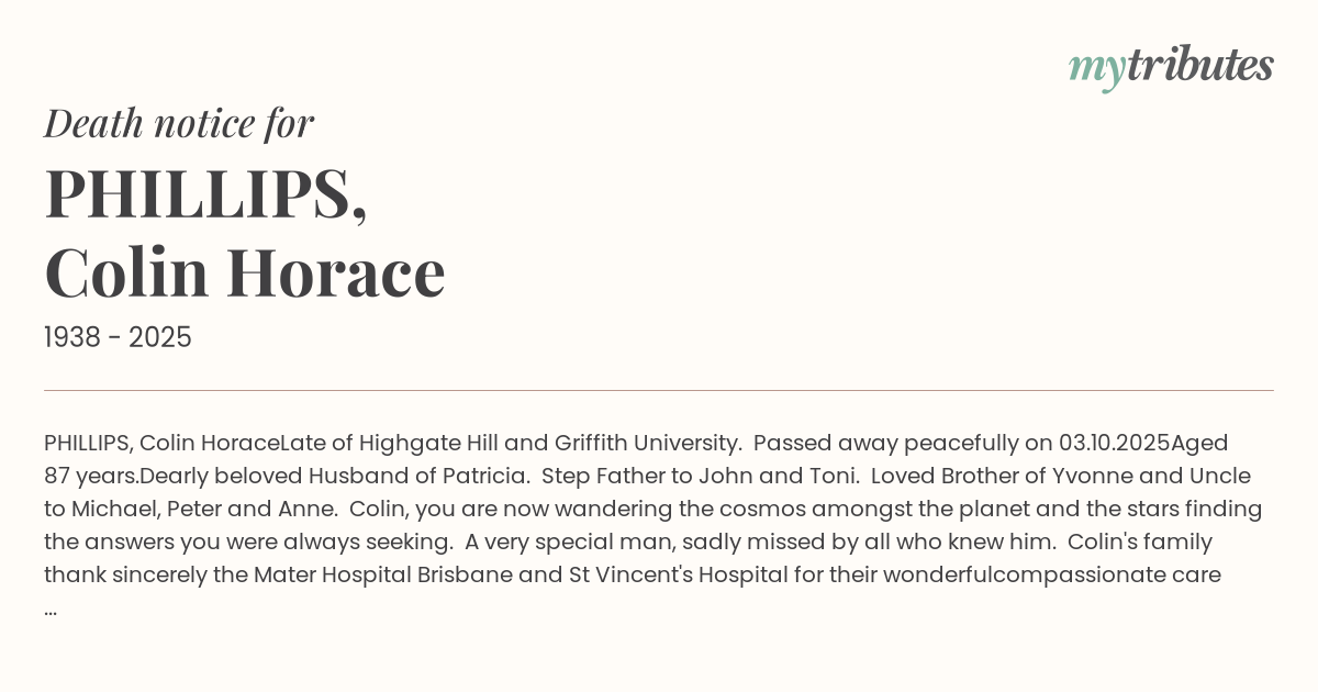 Colin's family thank sincerely the Mater Hospital Brisbane and St Vincent's Hospital