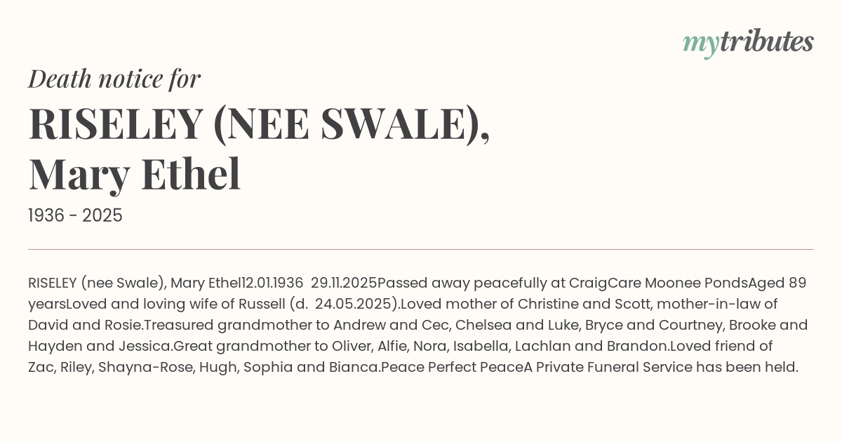 Great grandmother to Oliver, Alfie, Nora, Isabella, Lachlan and Brandon.