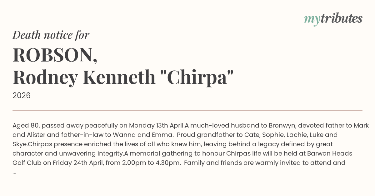 A memorial gathering to honour Chirpa’s life will be held at Barwon Heads Golf Club on Friday 24th April, from 2.00pm to 4.30pm. Family and friends are warmly invited to attend and share in remembering a remarkable man.