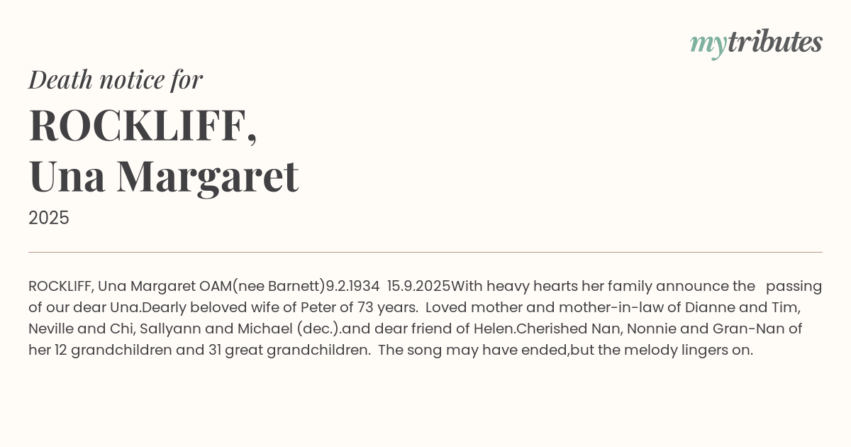 With heavy hearts her family announce the passing of our dear Una.