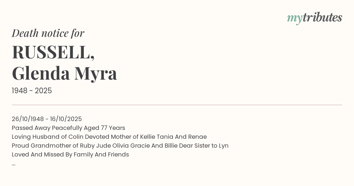 Loving Husband of Colin Devoted Mother of Kellie Tania And Renae