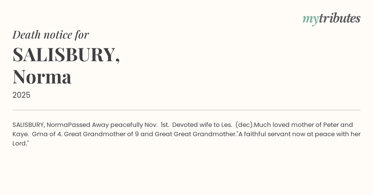 Much loved mother of Peter and Kaye. Gma of 4. Great Grandmother of 9 and Great Great Grandmother.