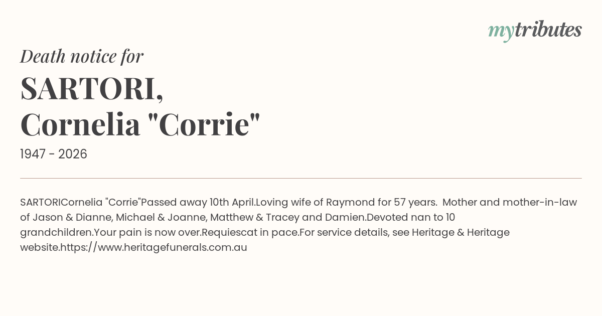 Loving wife of Raymond for 57 years. Mother and mother-in-law of Jason & Dianne, Michael & Joanne, Matthew & Tracey and Damien.