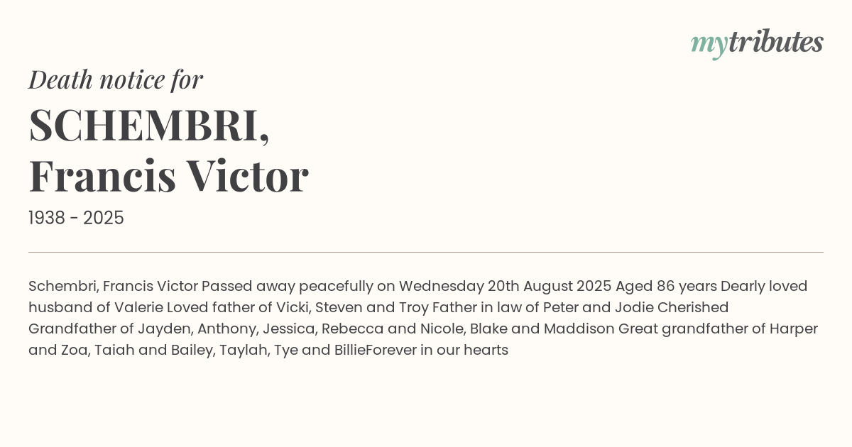 18°CSchembri, Francis Victor Passed away peacefully on Wednesday 20th August 2025 Aged 86 years