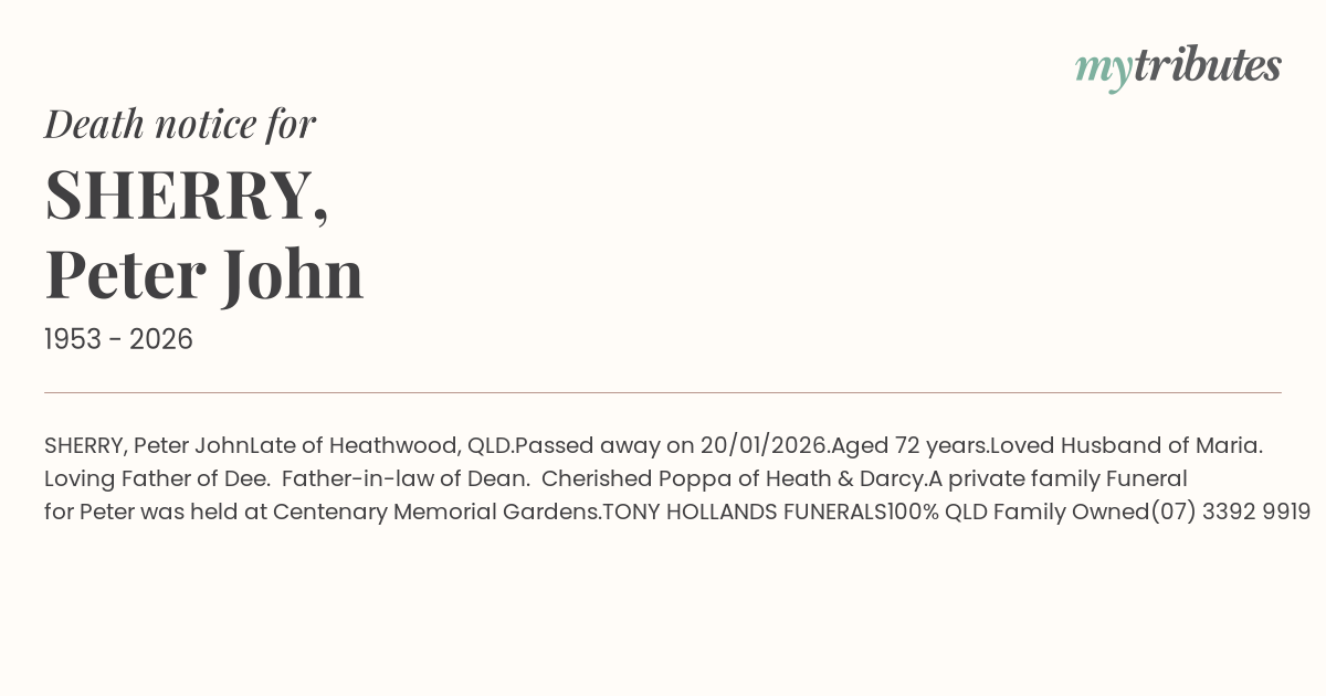 A private family Funeral for Peter was held at Centenary Memorial Gardens.