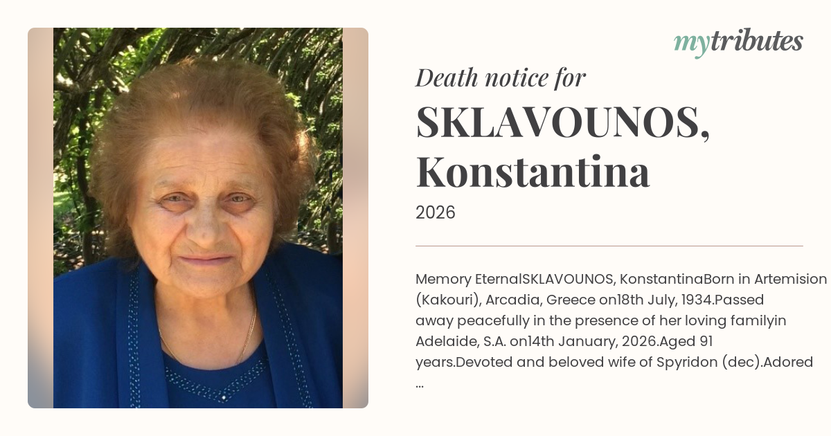 Devoted and beloved wife of Spyridon (dec).