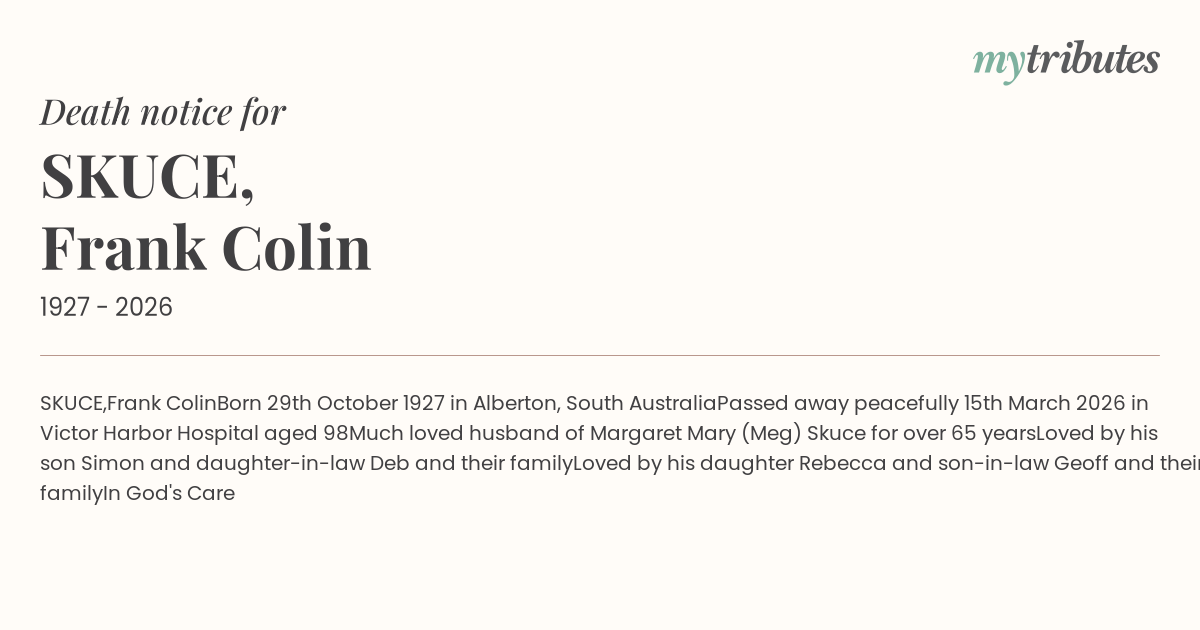 Much loved husband of Margaret Mary (Meg) Skuce for over 65 years