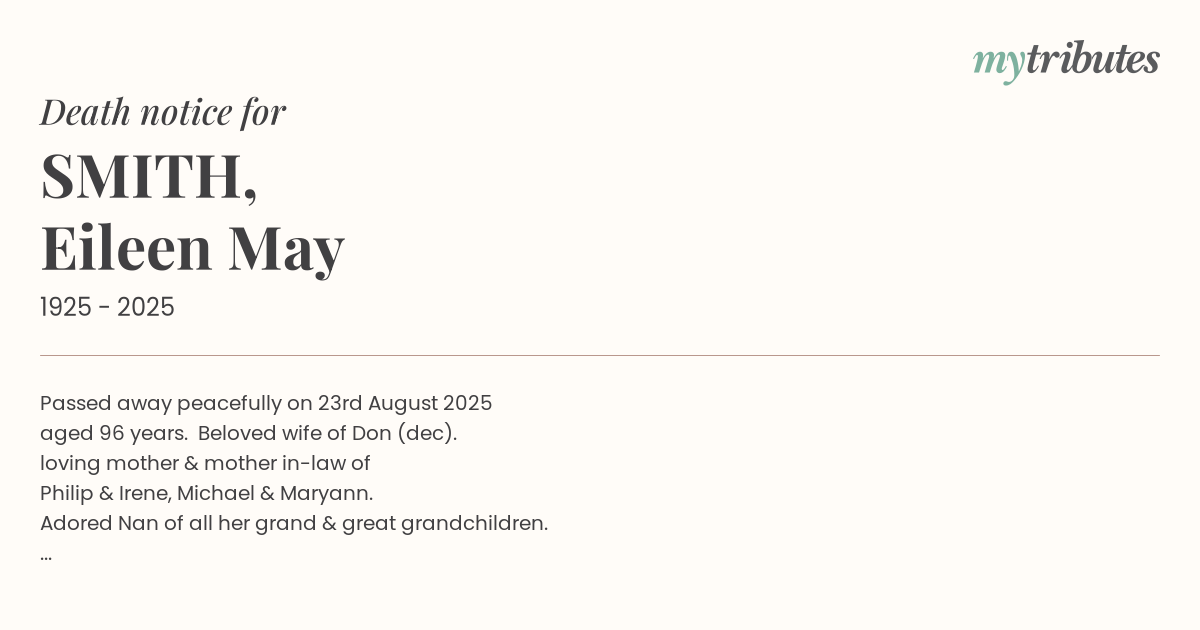18°CPassed away peacefully on 23rd August 2025 aged 96 years. Beloved wife of Don (dec). loving mother & mother in-law of Philip & Irene, Michael & Maryann. Adored Nan of all her grand & great grandchildren. At Rest