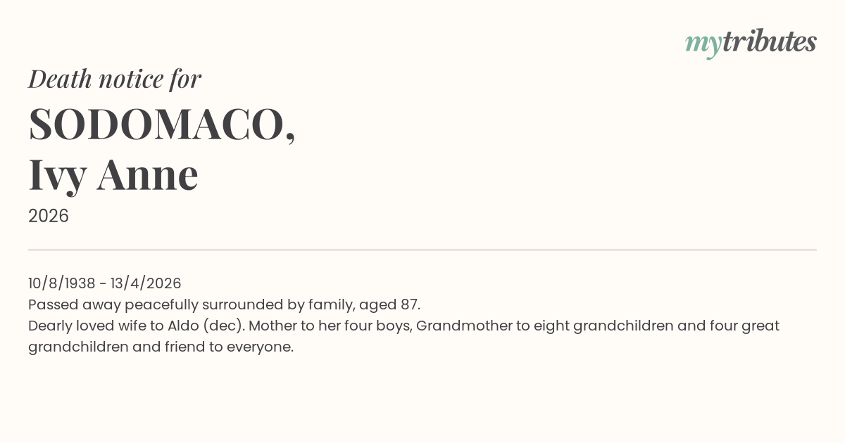 Dearly loved wife to Aldo (dec). Mother to her four boys, Grandmother to eight grandchildren and four great grandchildren and friend to everyone.