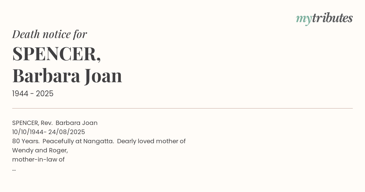18°CSPENCER, Rev. Barbara Joan 10/10/1944- 24/08/2025 80 Years. Peacefully at Nangatta. Dearly loved mother of Wendy and Roger, mother-in-law of Andrew and Angela. Treasured Grandmother of Spencer and Elliot, Narelle and Adam Great Grandmother of Aubrey, Piper and Oaklen, Fynn and Marlee. IN GOD’S CARE