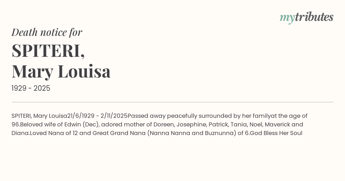 Beloved wife of Edwin (Dec), adored mother of Doreen, Josephine, Patrick, Tania, Noel,