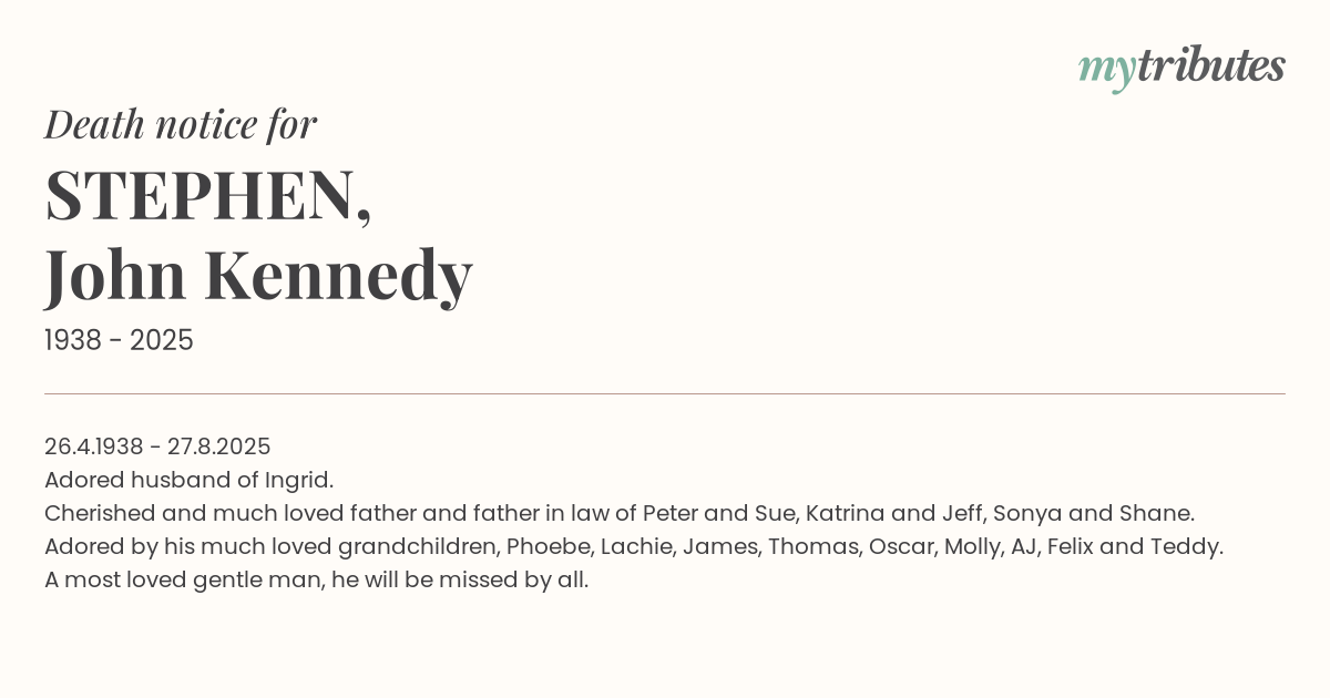 Adored by his much loved grandchildren, Phoebe, Lachie, James, Thomas, Oscar, Molly, AJ, Felix and Teddy.