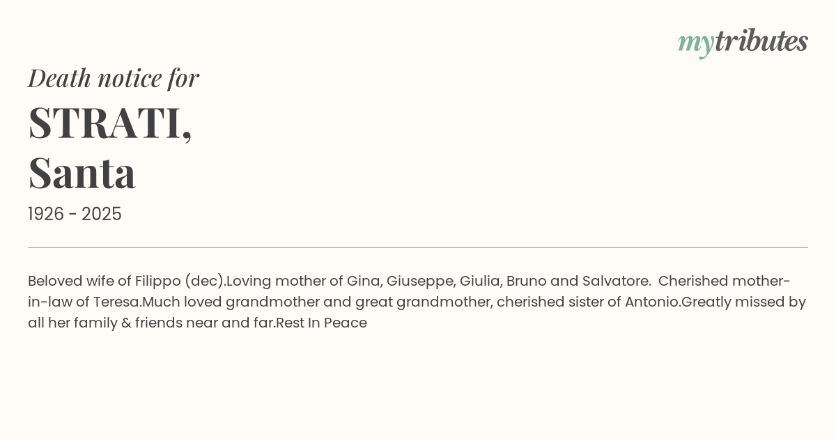 Loving mother of Gina, Giuseppe, Giulia, Bruno and Salvatore. Cherished mother-in-law of Teresa.