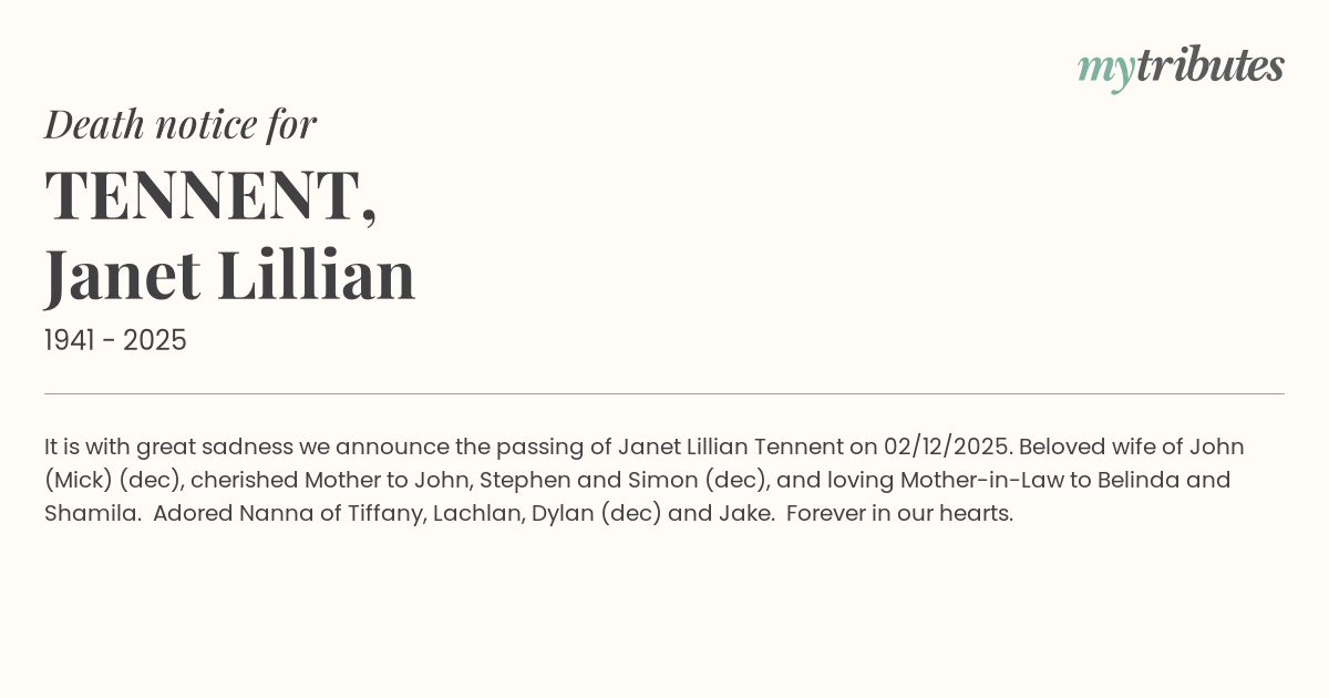 18°CIt is with great sadness we announce the passing of Janet Lillian Tennent on 02/12/2025.