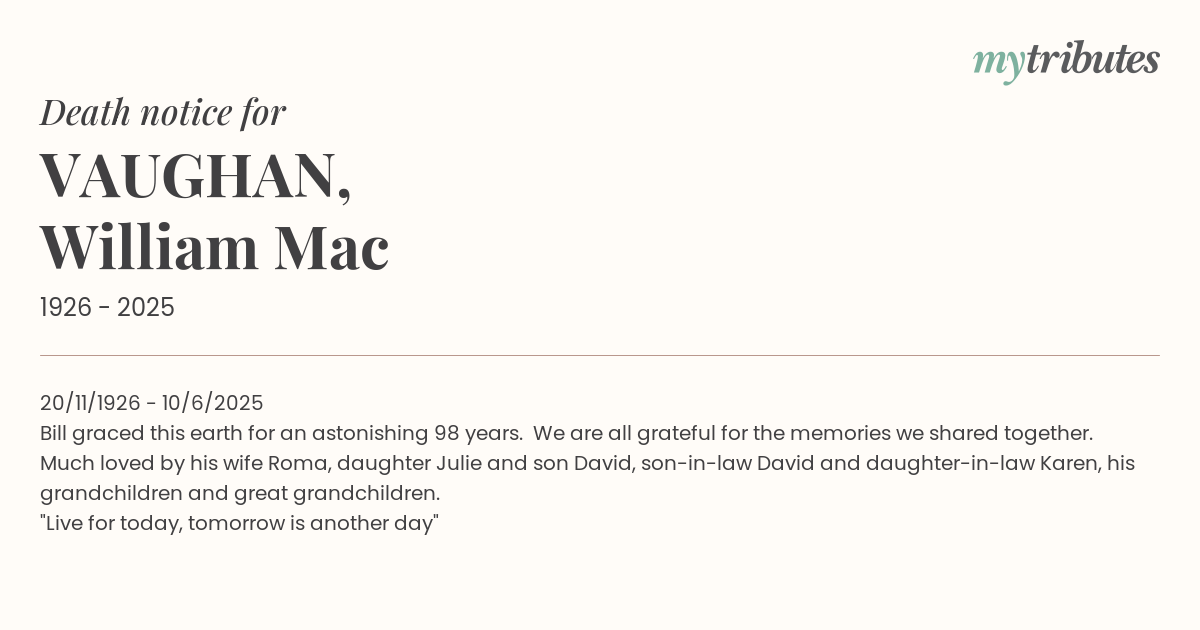 Much loved by his wife Roma, daughter Julie and son David, son-in-law David and daughter-in-law Karen, his grandchildren and great grandchildren.