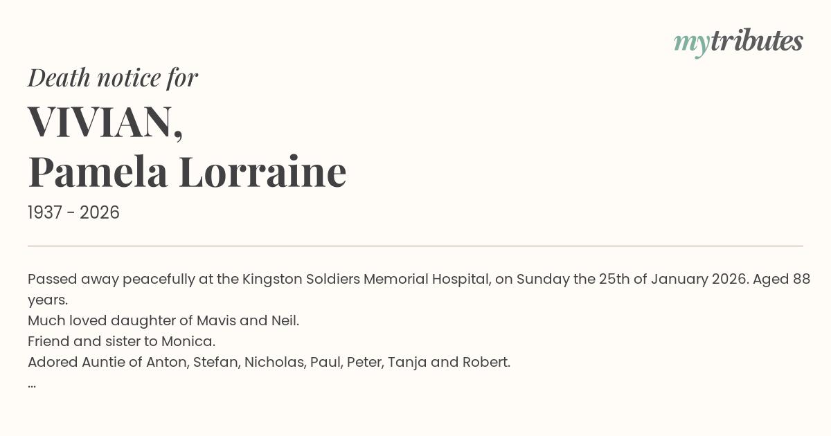 18°CPassed away peacefully at the Kingston Soldiers Memorial Hospital, on Sunday the 25th of January 2026. Aged 88 years.