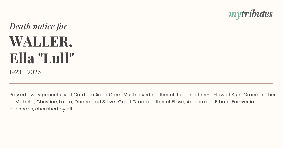 18°CPassed away peacefully at Cardinia Aged Care. Much loved mother of John, mother-in-law of Sue. Grandmother of Michelle, Christine, Laura, Darren and Steve. Great Grandmother of Elissa, Amelia and Ethan. Forever in our hearts, cherished by all.