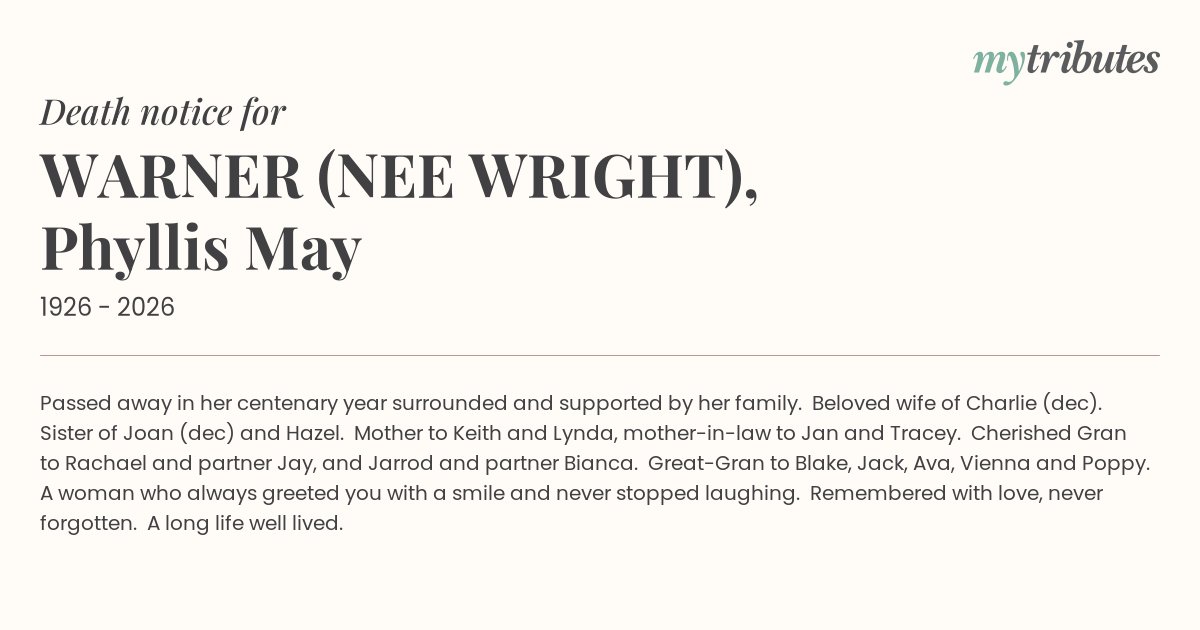 18°CPassed away in her centenary year surrounded and supported by her family. Beloved wife of Charlie (dec). Sister of Joan (dec) and Hazel. Mother to Keith and Lynda, mother-in-law to Jan and Tracey. Cherished Gran to Rachael and partner Jay, and Jarrod and partner Bianca. Great-Gran to Blake, Jack, Ava, Vienna and Poppy. A woman who always greeted you with a smile and never stopped laughing. Remembered with love, never forgotten. A long life well lived.