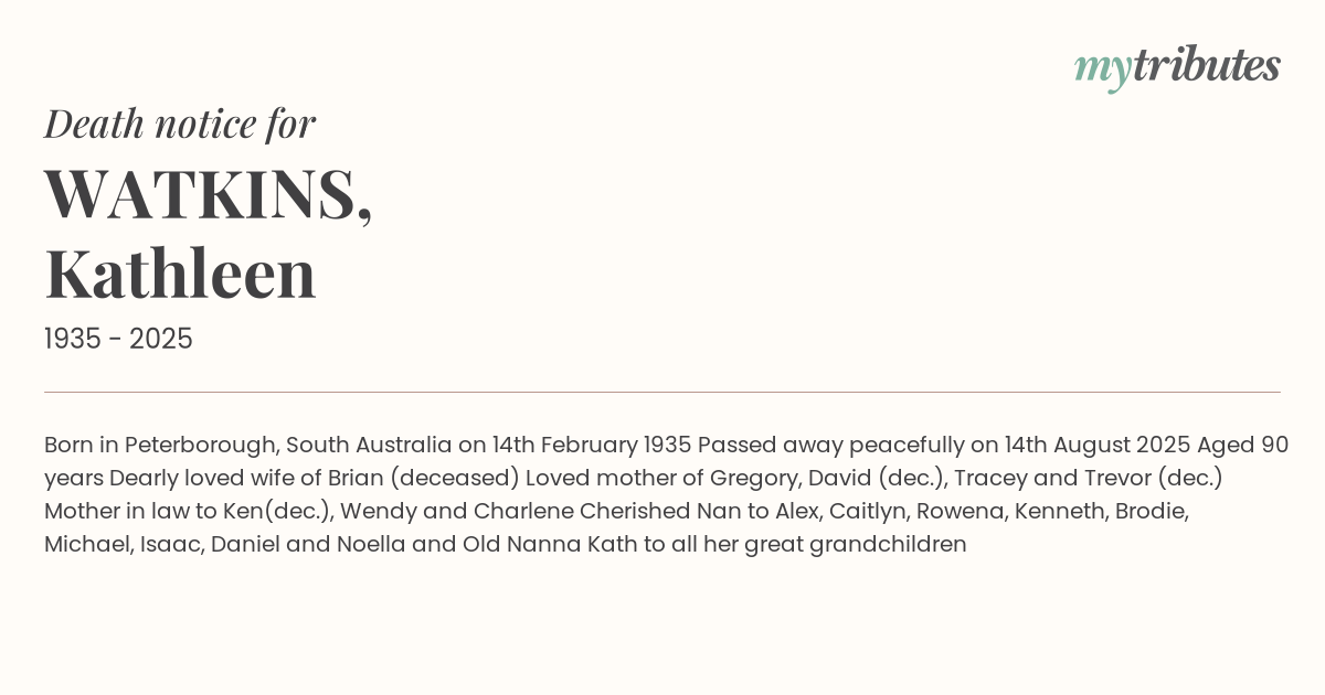 18°CBorn in Peterborough, South Australia on 14th February 1935 Passed away peacefully on 14th August 2025 Aged 90 years Dearly loved wife of Brian (deceased) Loved mother of Gregory, David (dec.), Tracey and Trevor (dec.) Mother in law to Ken(dec.), Wendy and Charlene Cherished Nan to Alex, Caitlyn, Rowena, Kenneth, Brodie, Michael, Isaac, Daniel and Noella and Old Nanna Kath to all her great grandchildren