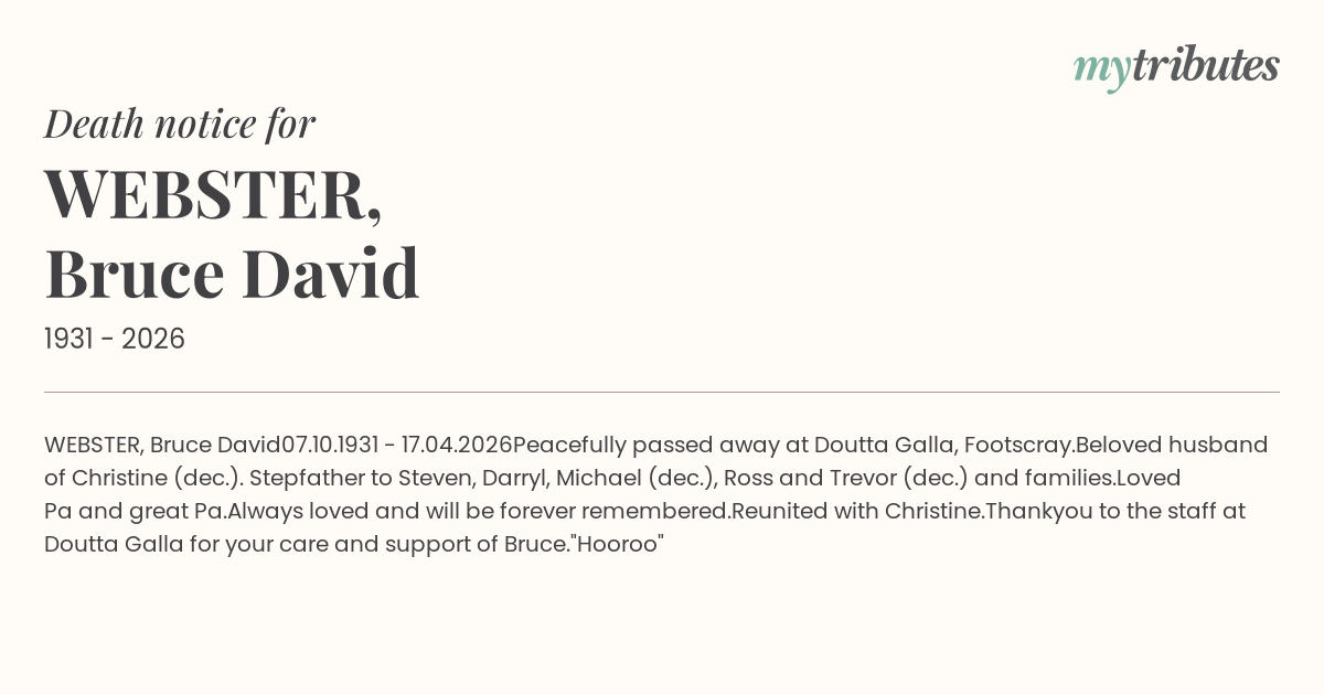 Beloved husband of Christine (dec.). Stepfather to Steven, Darryl, Michael (dec.), Ross and Trevor (dec.) and families.
