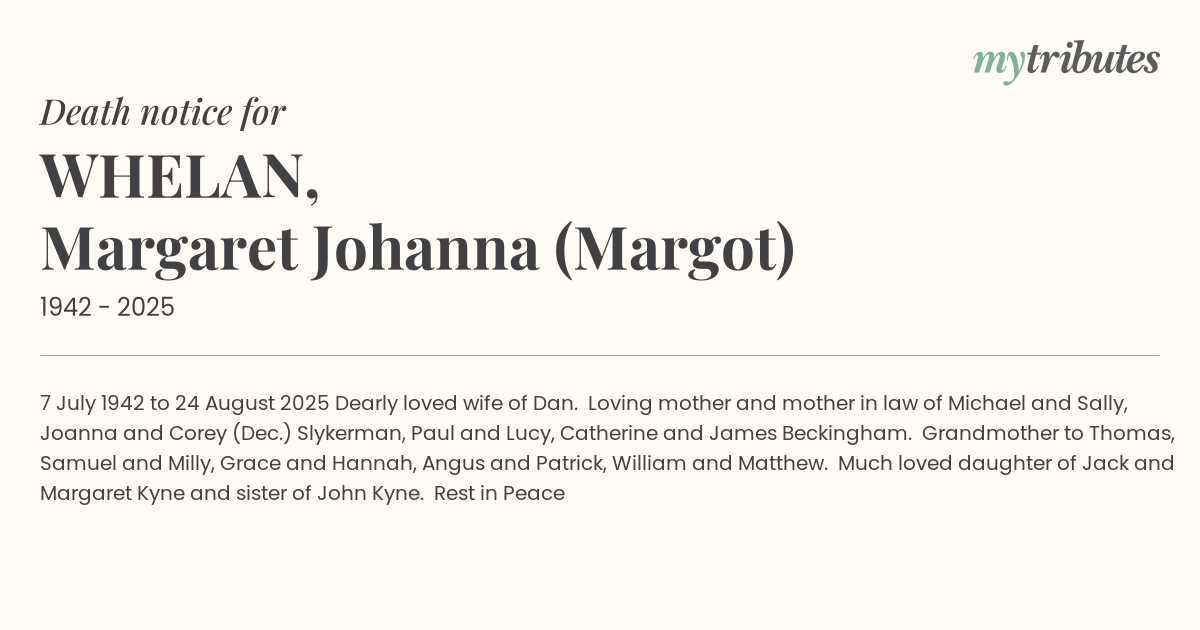 18°C7 July 1942 to 24 August 2025 Dearly loved wife of Dan. Loving mother and mother in law of Michael and Sally, Joanna and Corey (Dec.) Slykerman, Paul and Lucy, Catherine and James Beckingham. Grandmother to Thomas, Samuel and Milly, Grace and Hannah, Angus and Patrick, William and Matthew. Much loved daughter of Jack and Margaret Kyne and sister of John Kyne. Rest in Peace