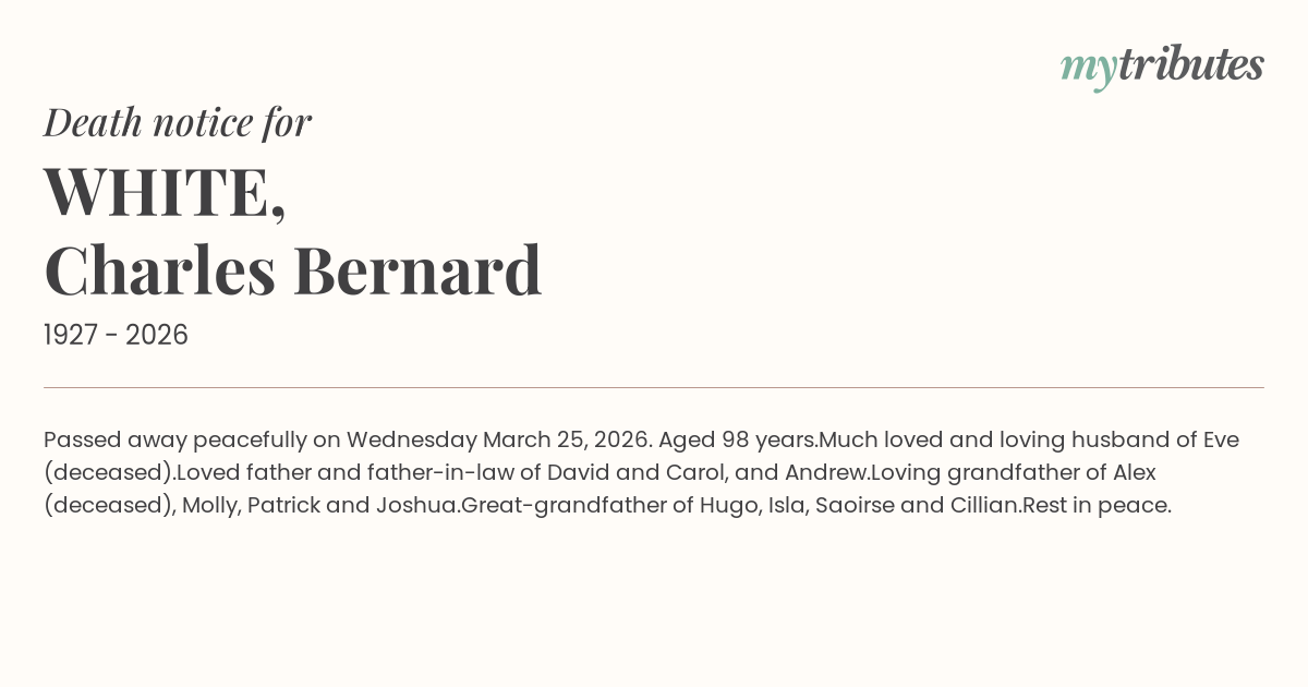 18°CPassed away peacefully on Wednesday March 25, 2026. Aged 98 years.