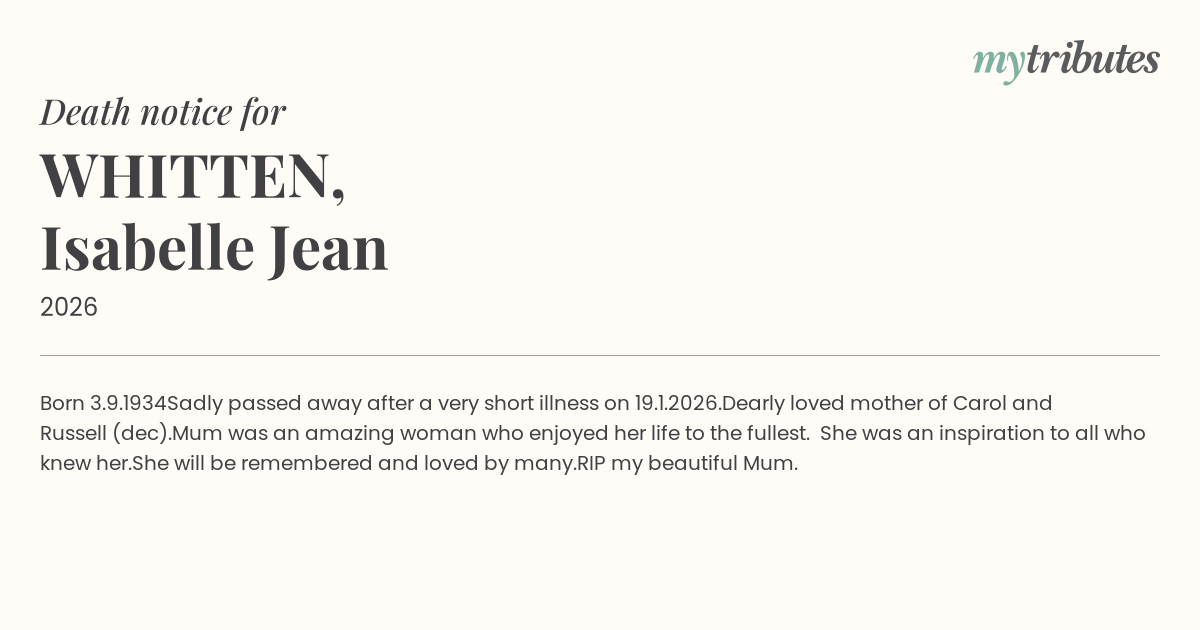 Mum was an amazing woman who enjoyed her life to the fullest. She was an inspiration to all who knew her.