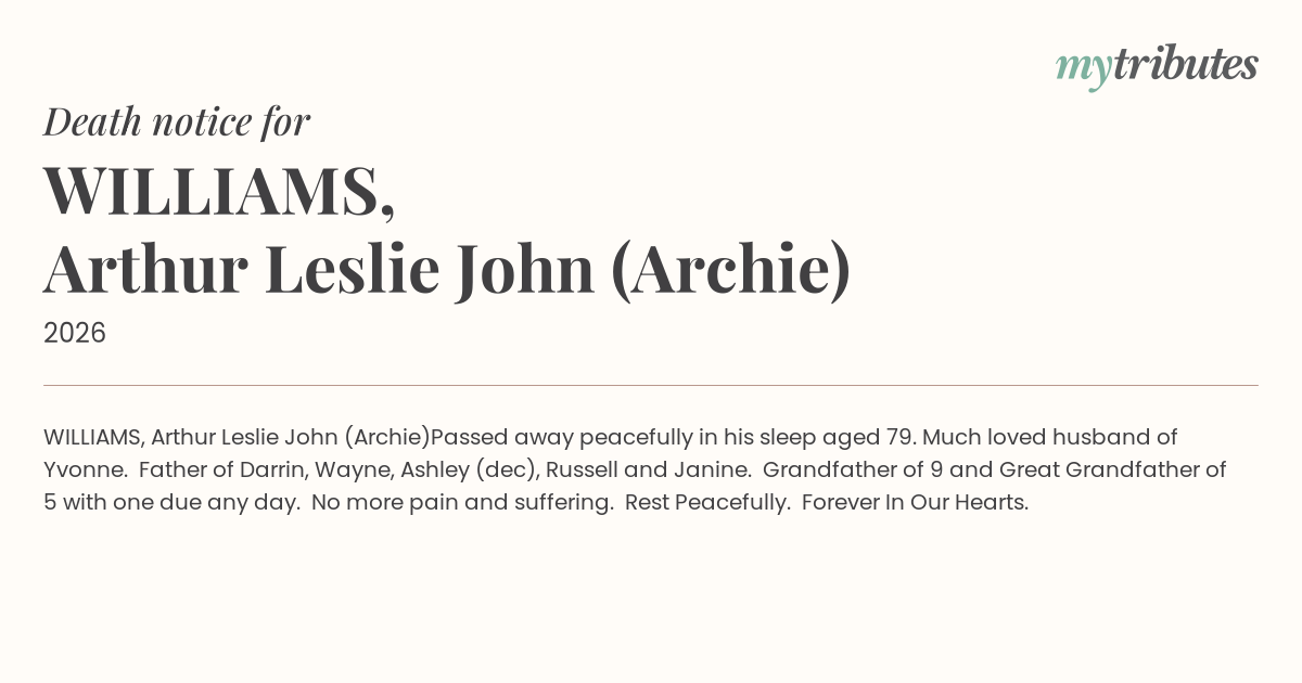 Much loved husband of Yvonne. Father of Darrin, Wayne, Ashley (dec), Russell and Janine. Grandfather of 9 and Great Grandfather of 5 with one due any day.
