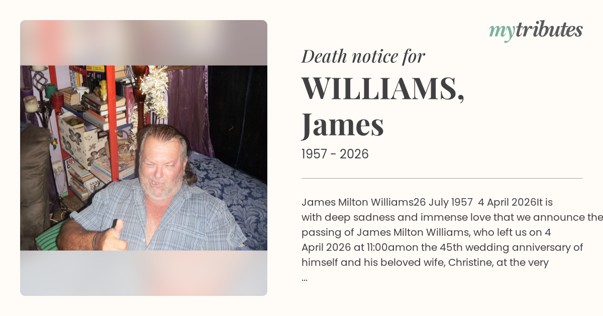 It is with deep sadness and immense love that we announce the passing of James Milton Williams, who left us on 4 April 2026 at 11:00am—on the 45th wedding anniversary of himself and his beloved wife, Christine, at the very hour they were married.