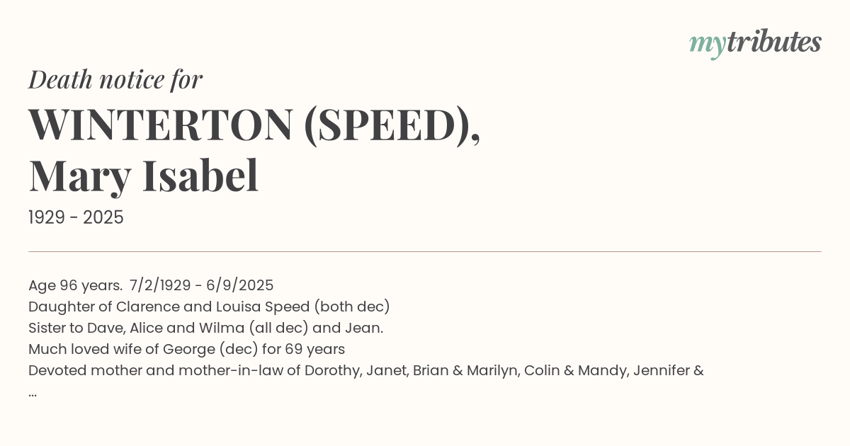 18°CAge 96 years. 7/2/1929 - 6/9/2025 Daughter of Clarence and Louisa Speed (both dec) Sister to Dave, Alice and Wilma (all dec) and Jean. Much loved wife of George (dec) for 69 years Devoted mother and mother-in-law of Dorothy, Janet, Brian & Marilyn, Colin & Mandy, Jennifer & Russell, Rhonda & Barry, Margaret & Richard. Much loved Nanna of 15, great Nanna to 13 and 2 on the way.