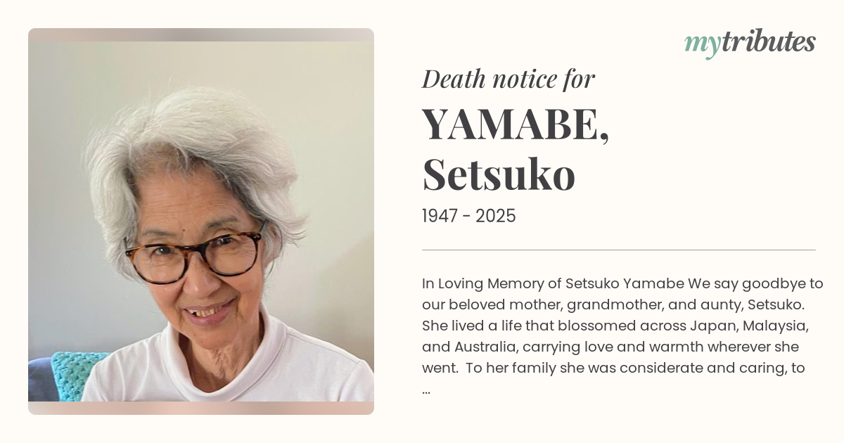 18°CIn Loving Memory of Setsuko Yamabe We say goodbye to our beloved mother, grandmother, and aunty, Setsuko. She lived a life that blossomed across Japan, Malaysia, and Australia, carrying love and warmth wherever she went. To her family she was considerate and caring, to her friends an inspiration and connection. Her spirit will live forever in our memories. Till we meet again. Sayonara, Okasan. Arigatou, Obachan.