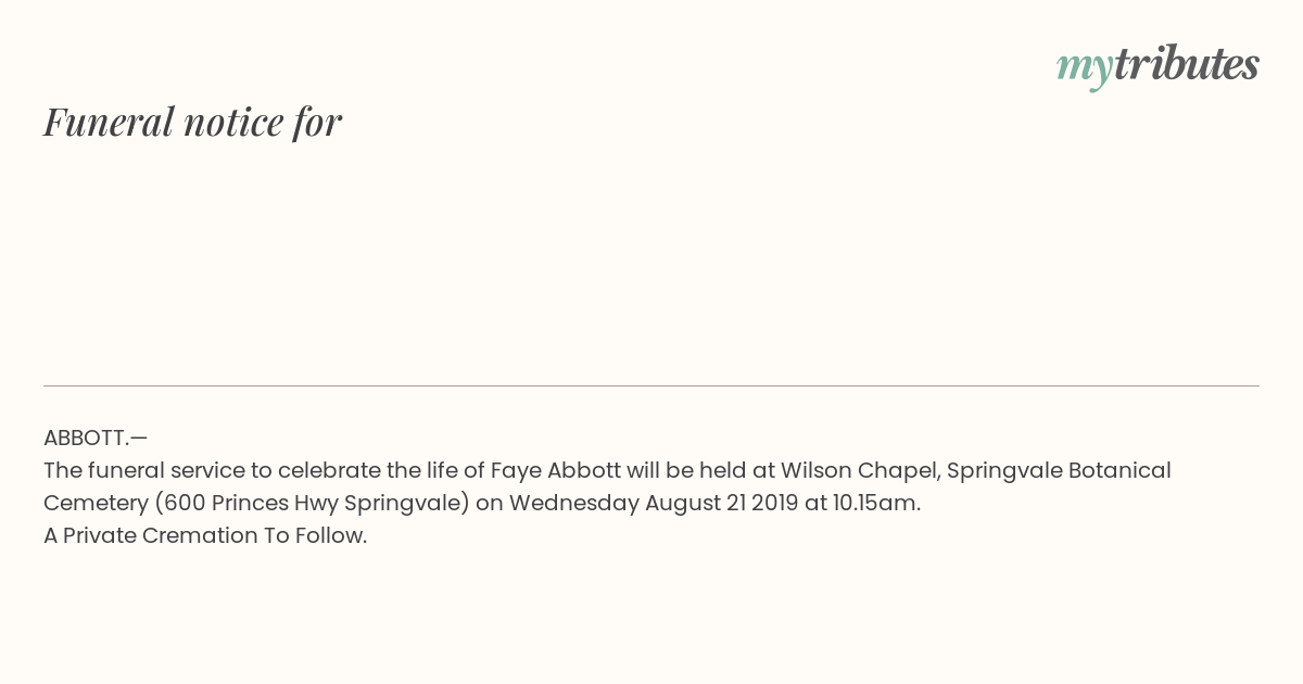 The funeral service to celebrate the life of Faye Abbott will be held at Wilson Chapel, Springvale Botanical Cemetery (600 Princes Hwy Springvale) on Wednesday August 21 2019 at 10.15am.