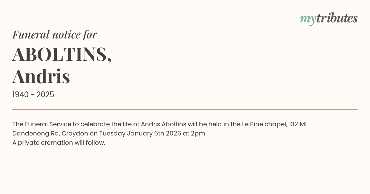 18°CThe Funeral Service to celebrate the life of Andris Aboltins will be held in the Le Pine chapel, 132 Mt Dandenong Rd, Croydon on Tuesday January 6th 2026 at 2pm. A private cremation will follow.