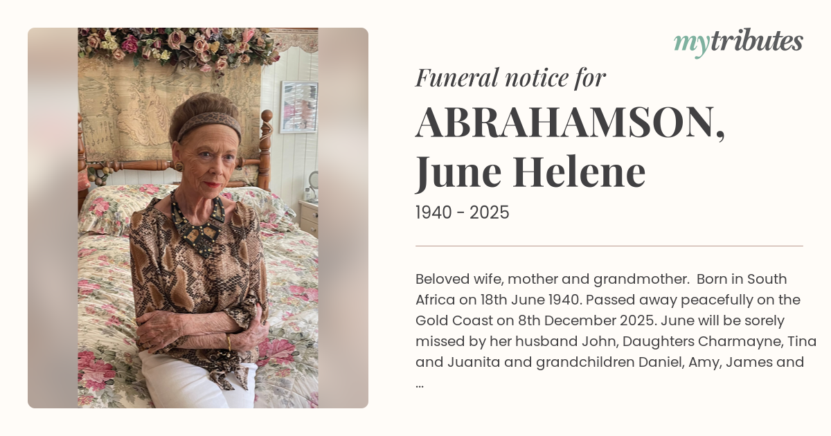 18°CBeloved wife, mother and grandmother. Born in South Africa on 18th June 1940. Passed away peacefully on the Gold Coast on 8th December 2025. June will be sorely missed by her husband John, Daughters Charmayne, Tina and Juanita and grandchildren Daniel, Amy, James and Jonny. June touched the lives of everyone she met, through her kindness, grace and timeless elegance. June was renowned as a floral designer at Hyatt Regency Sanctuary Cove, her creativity and effortless flare would shine through her beautiful creations.