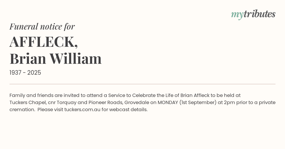 18°CFamily and friends are invited to attend a Service to Celebrate the Life of Brian Affleck to be held at Tuckers Chapel, cnr Torquay and Pioneer Roads, Grovedale on MONDAY (1st September) at 2pm prior to a private cremation. Please visit tuckers.com.au for webcast details.