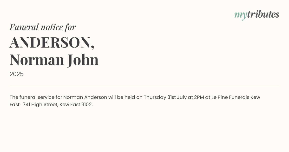 18°CThe funeral service for Norman Anderson will be held on Thursday 31st July at 2PM at Le Pine Funerals Kew East. 741 High Street, Kew East 3102.